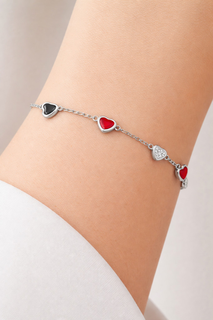 Finom anker szemekből álló ezüst karlánc, amelyen 2 cm-enként elhelyezett szív díszek adják a ritmust.